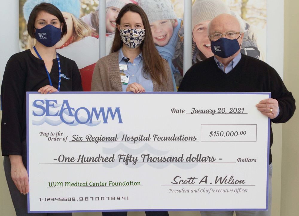 The $25,000 contributed to the University of Vermont Medical Center Foundation will be used to support the health care needs of the Greater Burlington community during the ongoing pandemic. Pictured (left to right) are SeaComm Assistant VP of Retail Operations & Regional Manager Yvonne Alterie, UVM Health Network Development Associate Karen Kalman and SeaComm Board Director Wayne Duso.